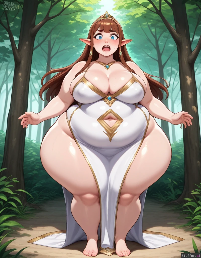 highly detailed, best quality, perfect anatomy, perfect lighting, perfect shading, perfect proportions, KAMII_MOMORU(artist), Krekkov(artist), Feastings2_(artist), blushyspicy_(artist), kittew_(artist), Cyancapsule(artist), (detailed eyes), (perfect eyes), ((big eyes, wide eyes)), (beautiful nose), Solo, One girl, elf girl, blue eyes, (middle age adult:1.2), (tall female:1.2), tight clothes, shiny skin, thick eyebrows, (wide eyes), sweaty, Dramatic lighting, in a forest, puffy nipples, (covered nipples, erect nipples), (teeth), (big cheekbones), (fat lips), (chubby legs: 1.5), (Large fat calves:1.1), (Gigantic butt:1.3), (Wide hips:1.5), (Obese:1.2), (Plumb breasts:0.6), (Trim belly:1.5), (Fat arms:0.9), (Small shoulders:1.3), (Bottom heavy:1.4), (Long white slit dress:1.2), (Scared look), (Tiara), (Cleavage), (Long straight dark brow hair), (Bare feet:1.2), (Tight clothes), (Golden loop earrings), (Solo), (Day time), (Skindentation), (View from front), (Looking at viewer), (Full_body_shot), (Standing:1.2), (Magic aura), (Screaming), (Wide stance),