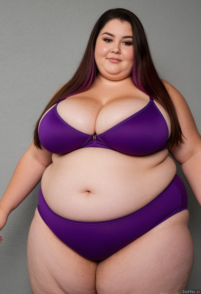 Tall curvy woman standing outside Long brown hair with purple highlights Wearing purple thong and purple tank top (((Large cleavage: 1.1, Very wide hips 1.9 weight gain 1.7 Extra Plump 1.8 Bigger fatter obese belly Enormous extra thick hips: 1.7)):1.5) Full body view
