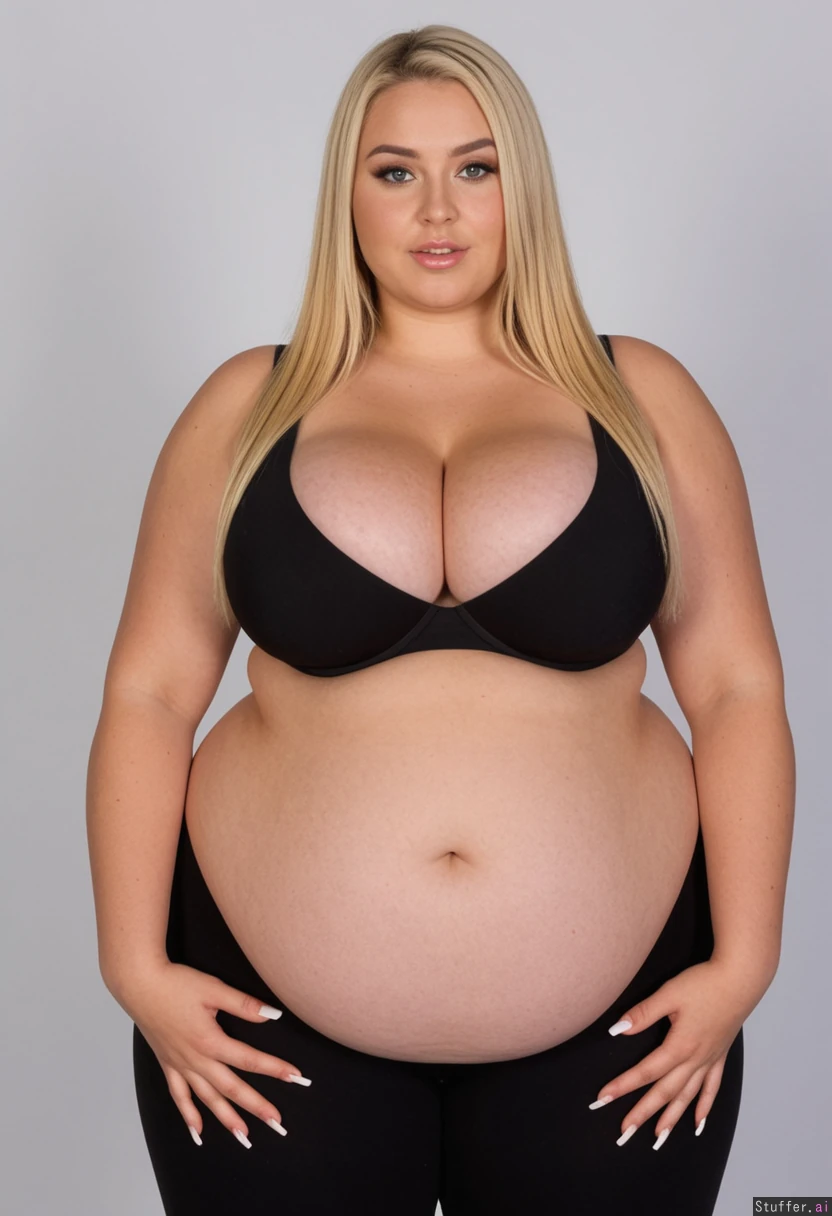 perfect 19 year old, messy fancy blonde hair, extreme beautiful model slim face, caucasian, long straight hair, blushes, tan skin, perfect Makeup, ((hyper fat cleavage:1.9)), (black leggings, small tiny bra:1.1) ((huge wide hips, massive thick thighs:1.5)), ((bigger fatter low sagging hanging soft belly:1.3)), (Big butt:1.3) ((long white nails)) Horny expression, flirting with viewer,