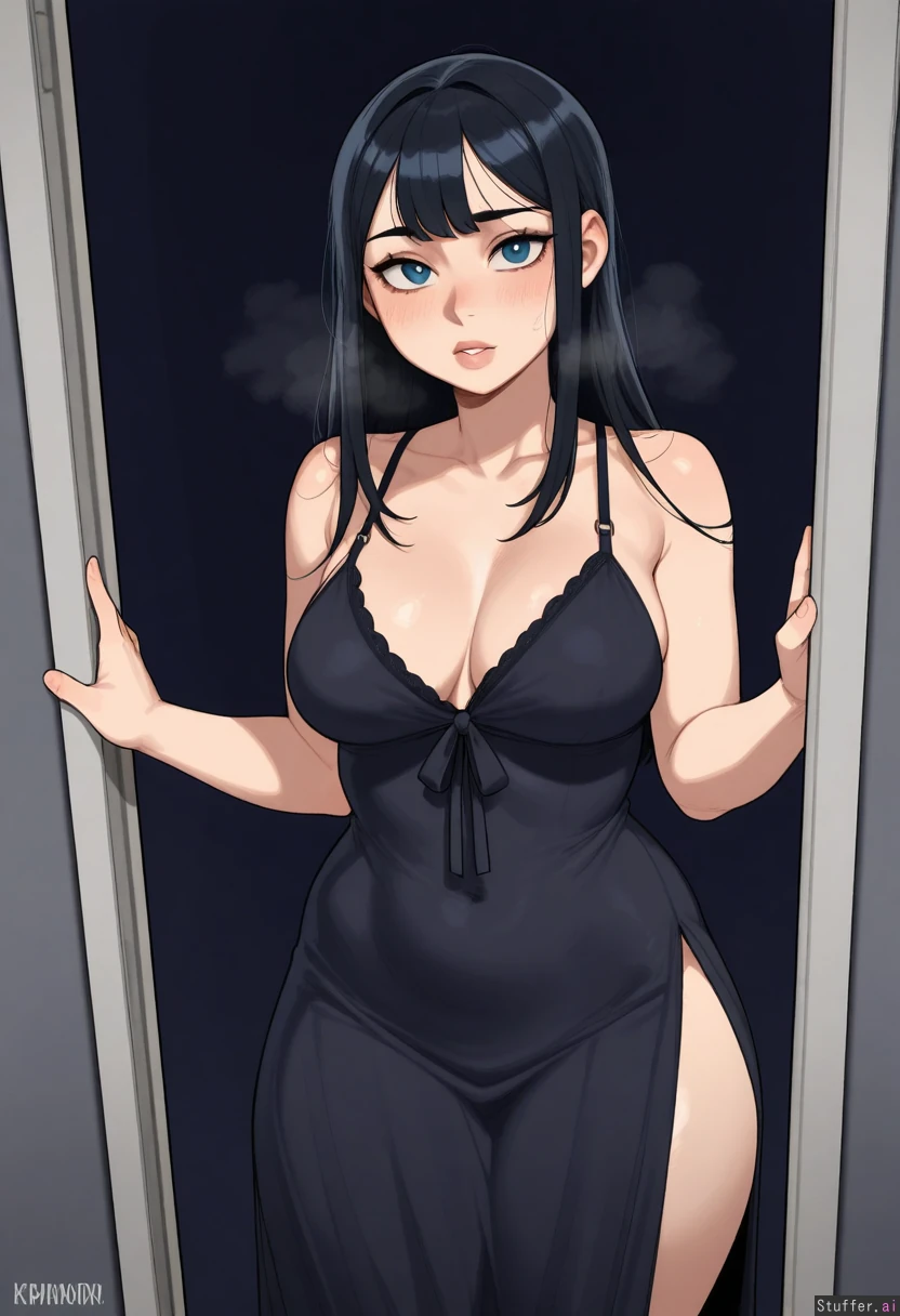 **base** highly detailed, best quality, perfect anatomy, perfect proportions, beautiful face, beautiful eyes, Solo, One girl, dramatic lighting, **artists** Krekkov (artist), KAMII MOMORU (artist), KipTeiTei (artist), **appearance** Black bangs, blue eyes, **clothes** Night gown, **setting** **pose** standing, squeezing her breasts, her fingers sink into her soft breasts, skindentation, (viewed from an angle that shows off all her curves), **expression** **body** (Breast milk leaking: 0.0), (Medium breasts: 1.0), (perky), (pregnant belly: 0.0), (Plump: 0.0), (Thick: 0.0), (Tight chubby belly: 0.0), (Bloated: 0.0),