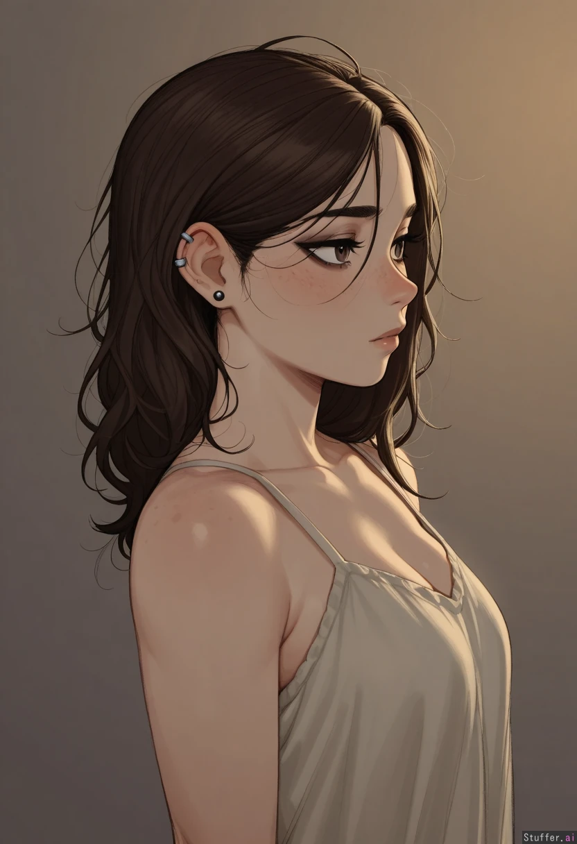 **base** highly detailed, best quality, perfect anatomy, perfect proportions, beautiful face, beautiful eyes, Solo, One girl, dramatic lighting, dynamic but focused composition, **artists** Krekkov (artist), KAMII MOMORU (artist), KipTeiTei (artist), **appearance** Brown bangs dark roots, brown eyes, piercings, heavy mascara, freckles, **clothes** Night gown, **setting** **pose** Stood sideways, side view, **expression** **body** (Breast milk leaking: 0.0), (Medium breasts: 0.0), (perky), (pregnant belly: 0.0), (Plump: 0.0), (Thick: 0.8), (Tight chubby belly: 0.0), (Bloated: 0.0),