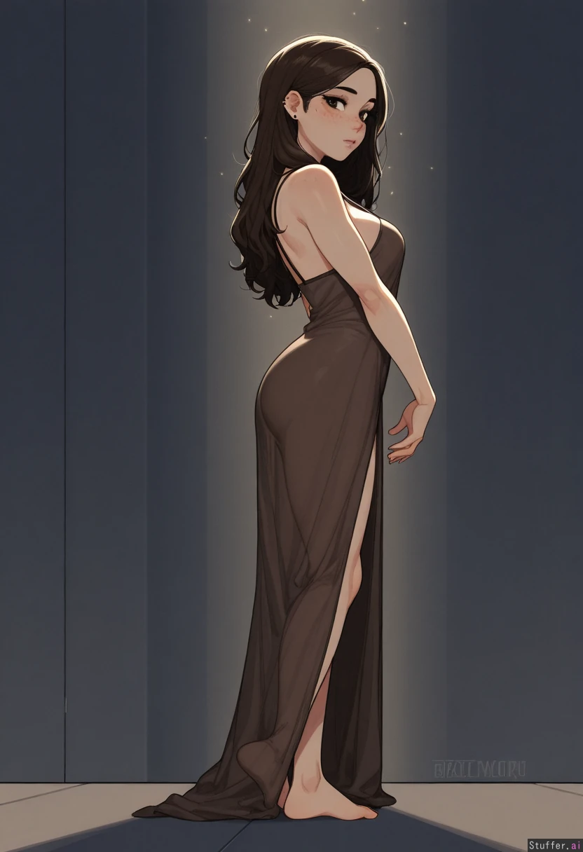 **base** highly detailed, best quality, perfect anatomy, perfect proportions, beautiful face, beautiful eyes, Solo, One girl, dramatic lighting, **artists** Krekkov (artist), KAMII MOMORU (artist), KipTeiTei (artist), **appearance** Brown bangs dark roots, brown eyes, piercings, heavy mascara, freckles, **clothes** Night gown, **setting** **pose** Stood sideways, side view, full body, **expression** **body** (Breast milk leaking: 0.0), (Medium breasts: 0.0), (perky), (pregnant belly: 0.0), (Plump: 0.0), (Thick: 0.8), (Tight chubby belly: 0.0), (Bloated: 0.0),