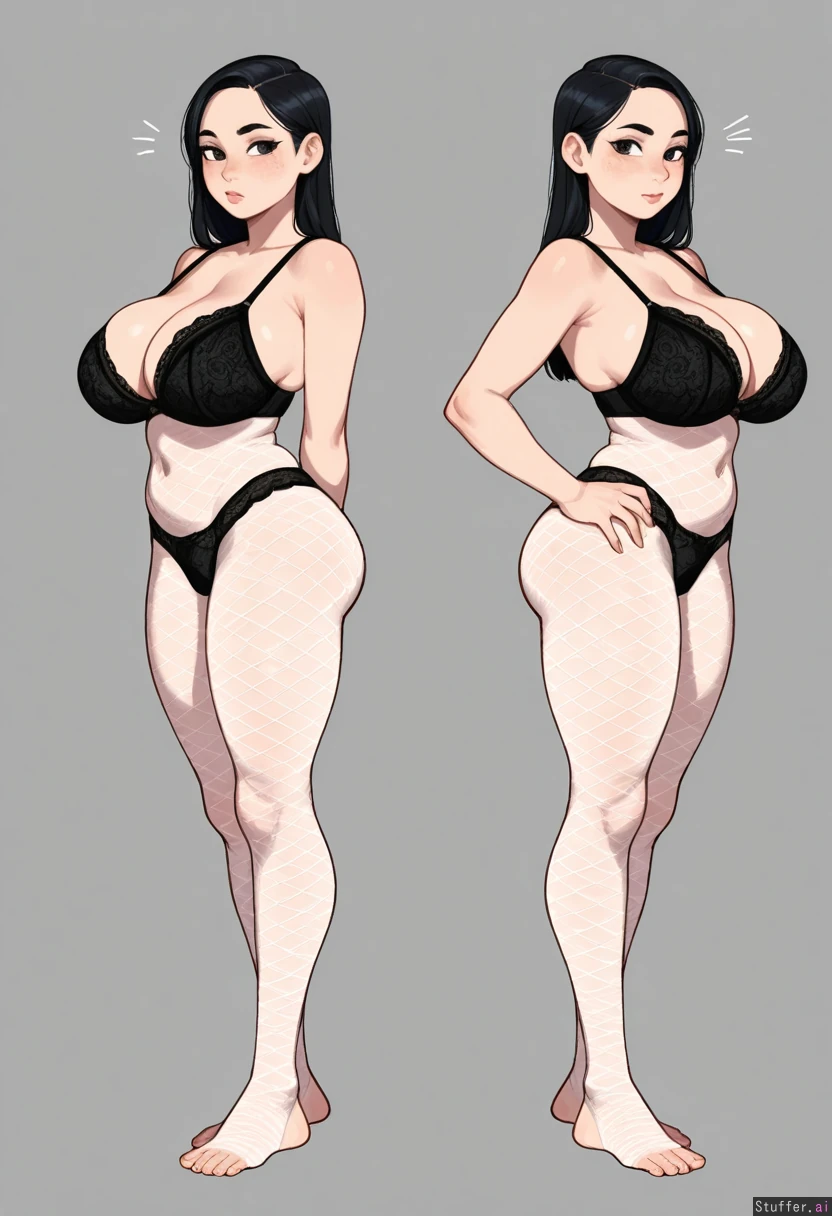 **base** highly detailed, best quality, perfect anatomy, perfect proportions, beautiful face, beautiful eyes, Solo, One girl, **artists** Krekkov (artist), KAMII MOMORU (artist), KipTeiTei (artist), **appearance** **clothes** Wearing off white crochet body stocking, black bra and panties, **setting** **pose** Stood sideways, side view, full body, stood straight, **expression** **body** (Breast milk leaking: 0.0), (Medium breasts: 0.0), (perky), (pregnant belly: 0.0), (Plump: 0.0), (Thick: 0.8), (Tight chubby belly: 0.0), (Bloated: 0.0),