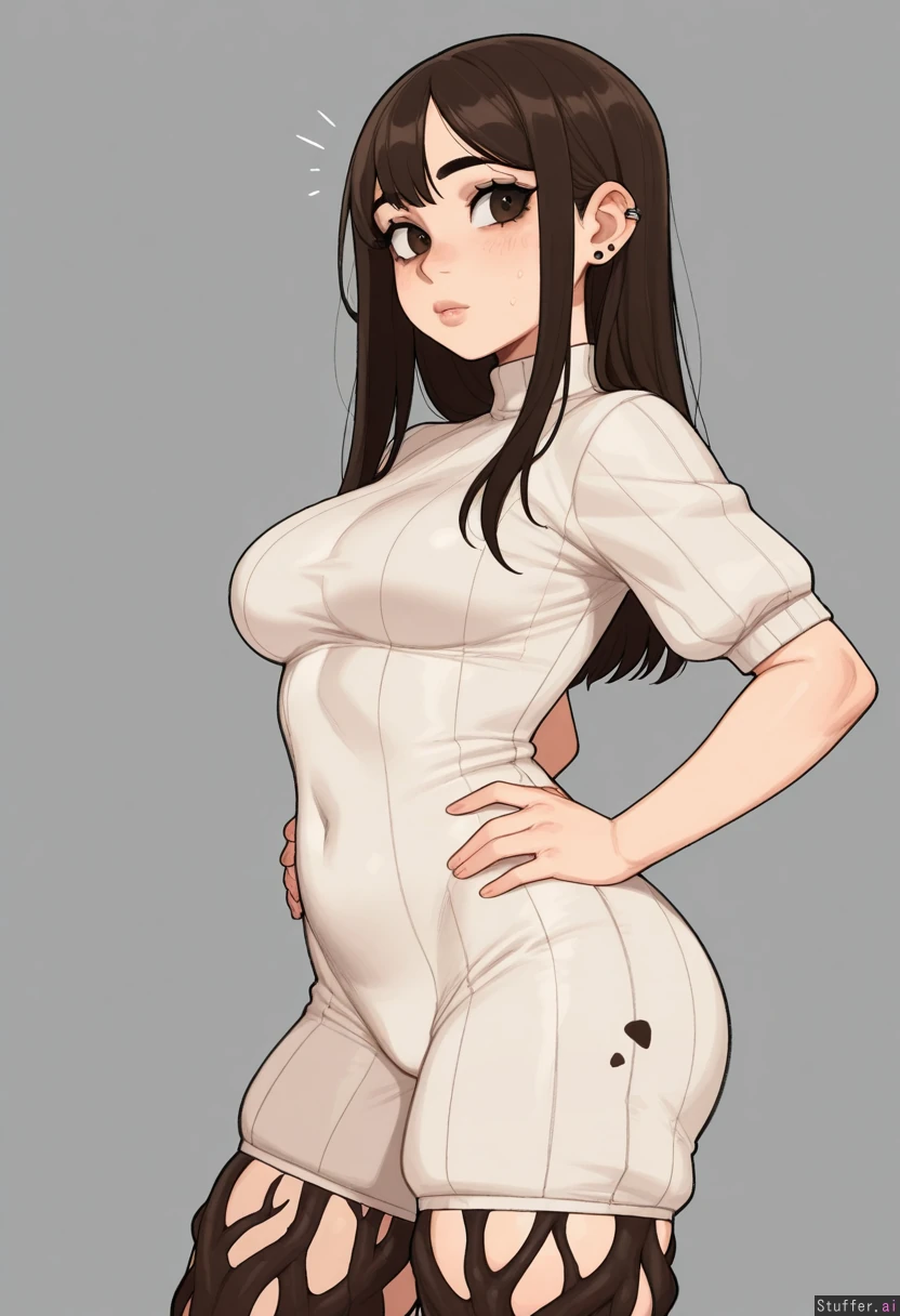 **base** highly detailed, best quality, perfect anatomy, perfect proportions, beautiful face, beautiful eyes, Solo, One girl, **artists** Krekkov (artist), KAMII MOMORU (artist), KipTeiTei (artist), **appearance** Brown bangs, dark roots, brown eyes, mascara, piercing, **clothes** Romper, **setting** **pose** 90 degree Side view, standing sideways , hands on hips, standing straight, **expression** **body** (Breast milk leaking: 0.0), (Medium breasts: 1.0), (perky), (Bubble butt: 0.8), (pregnant belly: 0.0), (Plump: 0.8), (Thick: 0.8), (Tight chubby belly: 0.0), (Bloated: 0.0),