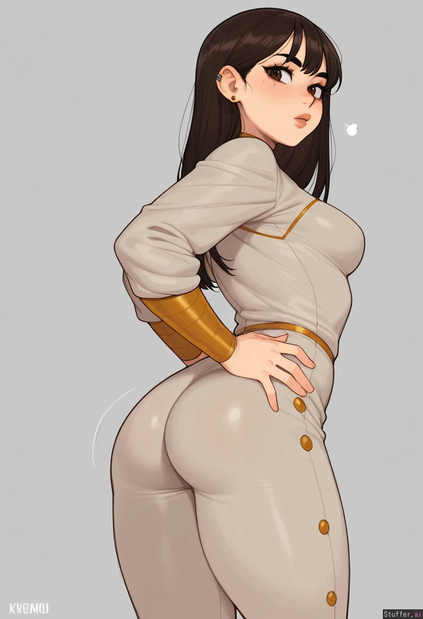 **base** highly detailed, best quality, perfect anatomy, perfect proportions, beautiful face, beautiful eyes, Solo, One girl, **artists** Krekkov (artist), KAMII MOMORU (artist), KipTeiTei (artist), **appearance** Brown bangs, brown eyes, mascara, piercing, **clothes** Romper, **setting** **pose** 90 degree Side view, standing sideways , hands on hips, standing straight, **expression** **body** (Breast milk leaking: 0.0), (Medium breasts: 1.0), (perky), (Bubble butt: 0.8), (pregnant belly: 0.0), (Plump: 0.8), (Thick: 0.8), (Tight chubby belly: 0.0), (Bloated: 0.0),