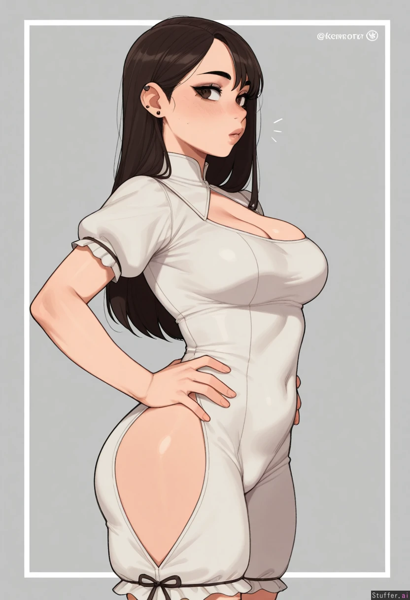 **base** highly detailed, best quality, perfect anatomy, perfect proportions, beautiful face, beautiful eyes, Solo, One girl, **artists** Krekkov (artist), KAMII MOMORU (artist), KipTeiTei (artist), **appearance** Brown bangs, brown eyes, mascara, piercing, **clothes** White romper, neckline, **setting** **pose** 90 degree Side view, standing sideways , hands on hips, standing straight, **expression** **body** (Breast milk leaking: 0.0), (Medium breasts: 1.0), (perky), (Bubble butt: 0.8), (pregnant belly: 0.0), (Plump: 0.8), (Thick: 0.8), (Tight chubby belly: 0.0), (Bloated: 0.0),