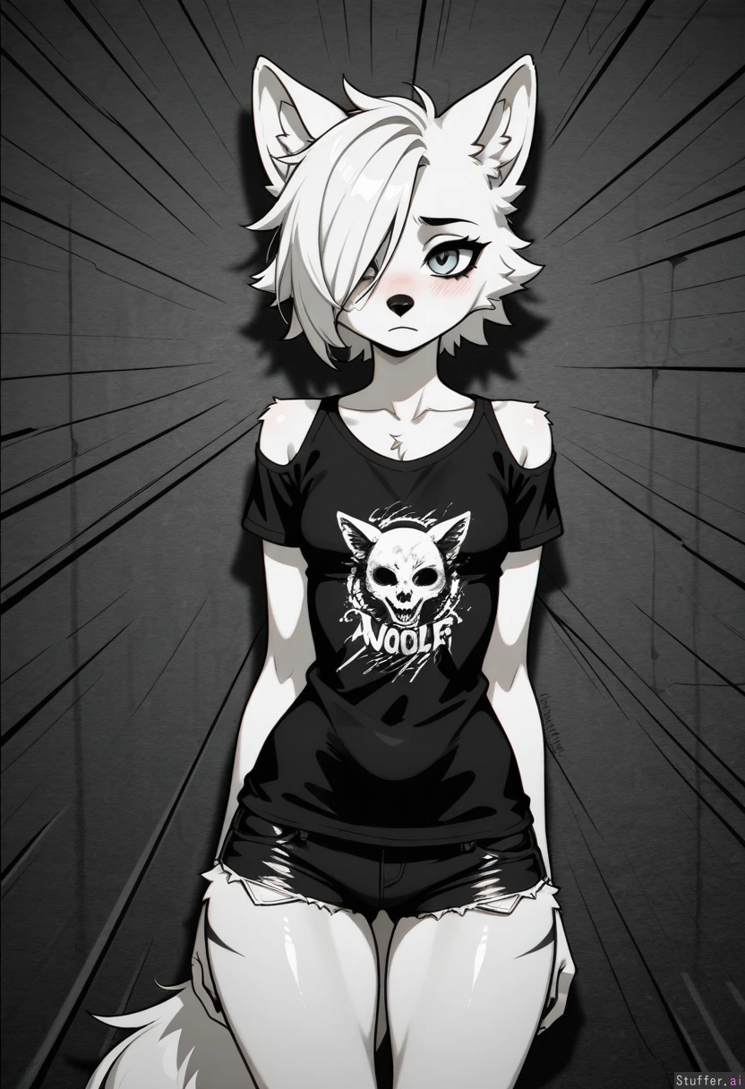 Zoomorph, HD, defined lines, furry art, emo, High Definition, 4K, full color, solo, one character, anthropomorphic, anthropomorphism, anthropomorphic wolf, female wolf, small breasts, narrow shoulders, narrow hips, averted gaze, shy, hair-over-one-eye, grunge t-shirt, short shorts