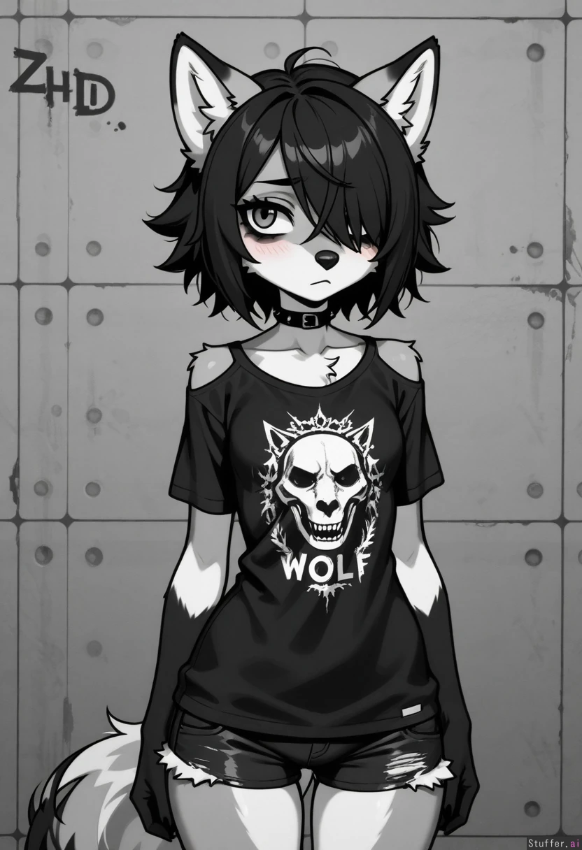 Zoomorph, HD, defined outlines, furry art, emo, High Definition, 4K, full color, solo, one character, anthropomorphic, anthropomorphism, anthropomorphic wolf, female wolf, small breasts, narrow shoulders, narrow hips, averted gaze, shy, hair-over-one-eye, grunge t-shirt, short shorts