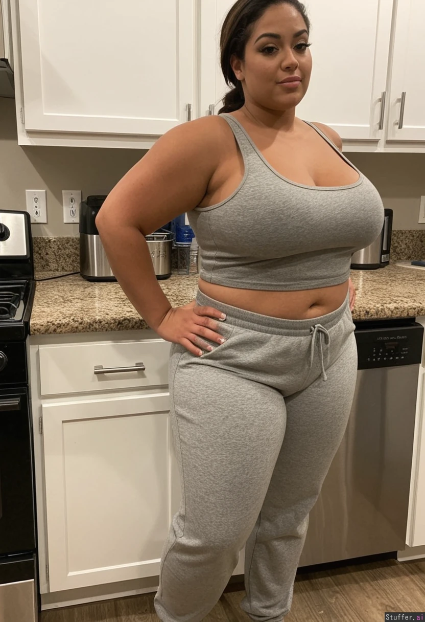 Curvy woman in kitchen Gray sweatpants Gray tank top