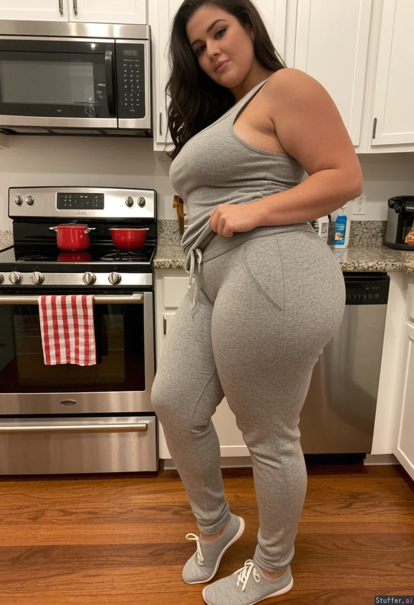 Curvy woman in kitchen Gray sweatpants Gray tank top