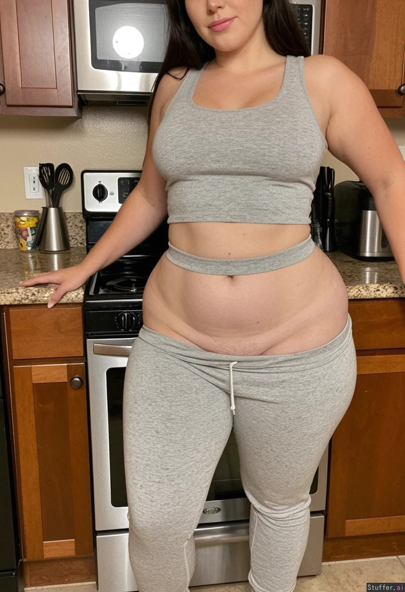 Curvy woman in kitchen Gray sweatpants Gray tank top (Skinny waist) 1.8 (Massive thick hips) 0.2