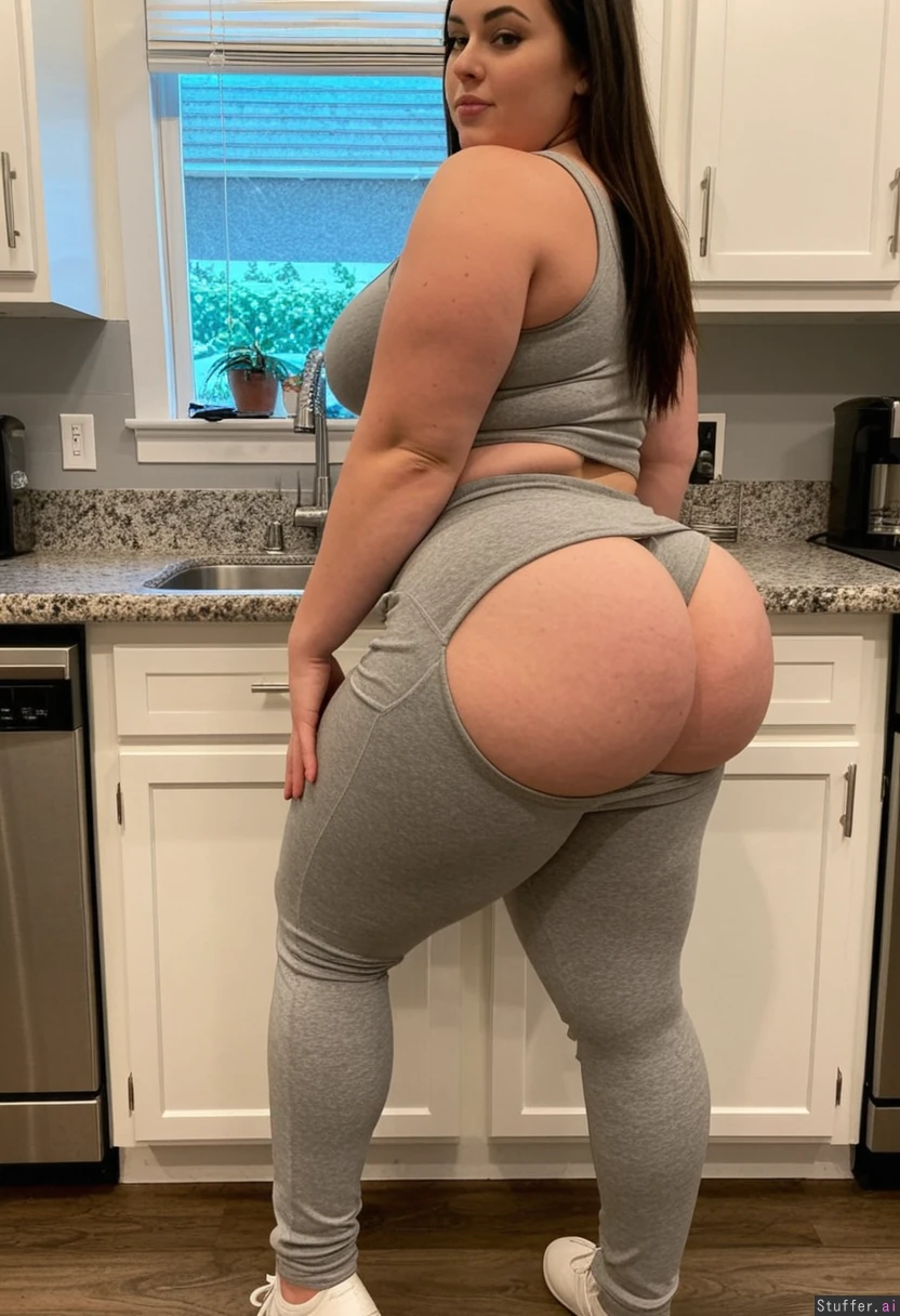 Curvy woman in kitchen Gray sweatpants Gray tank top (Skinny waist) 1.8 (Massive wide thick hips) 0.2