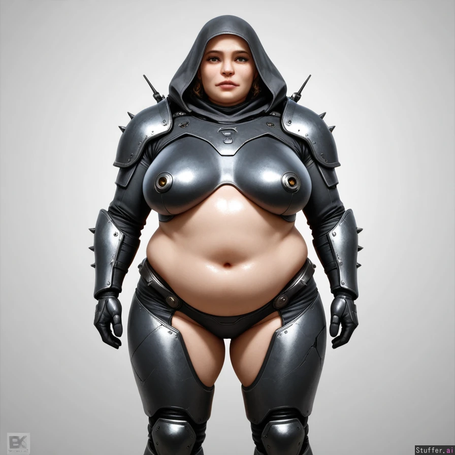 (best quality), (high rating), absurd res, high res, detailed, ultra quality, ((high quality)), masterpiece, (ultra high resolution), photorealistic,, detailed face, intricate detail, sophisticated detail, exquisite detail, absurd resolution, correct anatomy, 8k, (highly detailed face), highly detailed skin texture, scifi, bright colorful style Fat girl, standing, gripping stomach, big fat soft thighs, full suit of armor, undersized broken leg armor, gaps in broken leg armor, thighs bulging out of gaps in leg armor