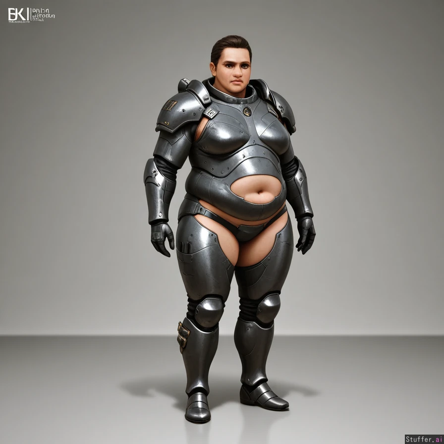 (best quality), (high rating), absurd res, high res, detailed, ultra quality, ((high quality)), masterpiece, (ultra high resolution), photorealistic,, detailed face, intricate detail, sophisticated detail, exquisite detail, absurd resolution, correct anatomy, 8k, (highly detailed face), highly detailed skin texture, scifi, bright colorful style Fat girl, standing, gripping stomach, big fat soft thighs, full suit of armor, undersized broken leg armor, gaps in broken leg armor, thighs bulging out of gaps in leg armor