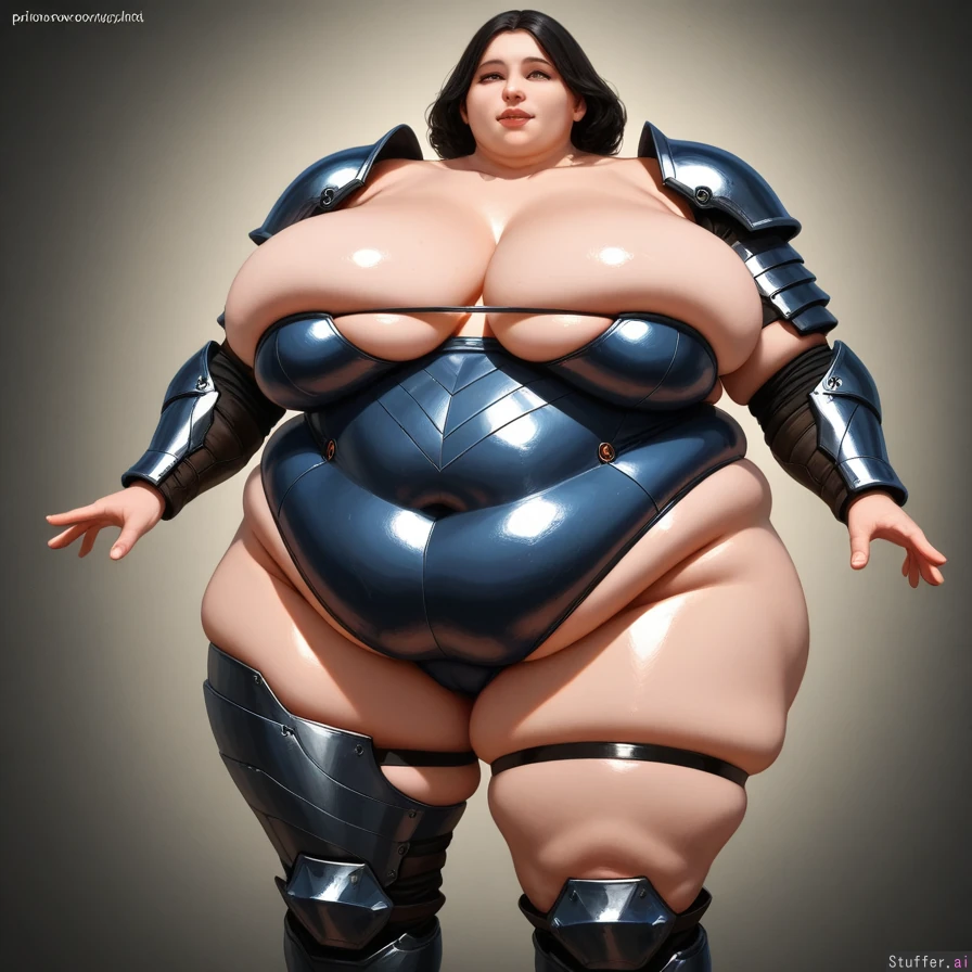 (best quality), (high rating), absurd res, high res, detailed, ultra quality, ((high quality)), masterpiece, (ultra high resolution), photorealistic,, detailed face, intricate detail, sophisticated detail, exquisite detail, absurd resolution, correct anatomy, 8k, (highly detailed face), highly detailed skin texture, scifi, bright colorful style (Wide Fat girl:1.5), standing, gripping stomach, big fat soft thighs, full suit of armor, (undersized:1.9) broken leg armor, gaps in broken leg armor, (thighs bulging out of gaps in leg armor:1.6)