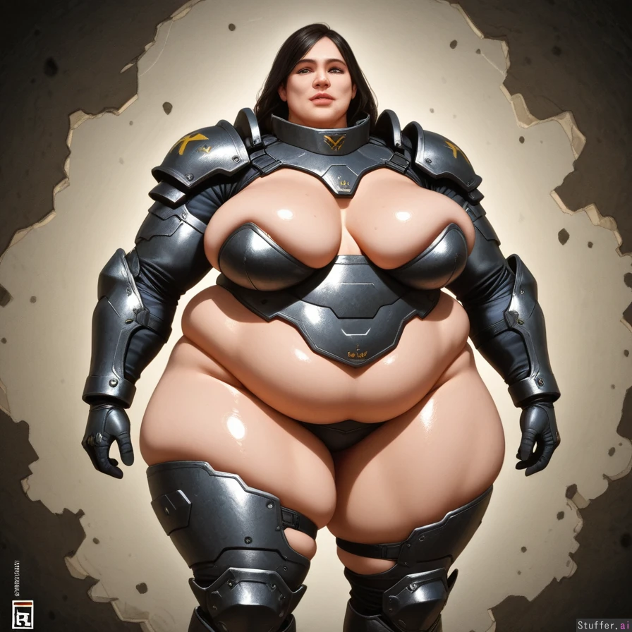 (best quality), (high rating), absurd res, high res, detailed, ultra quality, ((high quality)), masterpiece, (ultra high resolution), photorealistic,, detailed face, intricate detail, sophisticated detail, exquisite detail, absurd resolution, correct anatomy, 8k, (highly detailed face), highly detailed skin texture, scifi, bright colorful style (Wide Fat girl:1.5), slim feminine face, standing, gripping stomach, (big fat soft thighs:1.8), (big fat soft biceps and forearms:1.0), full suit of futuristic soldier armor, (undersized:1.9) broken pieces leg armor squeezing legs, gaps in broken leg armor, (thighs bulging out of gaps in leg armor:1.6), broken pieces of armor squeezing arms,