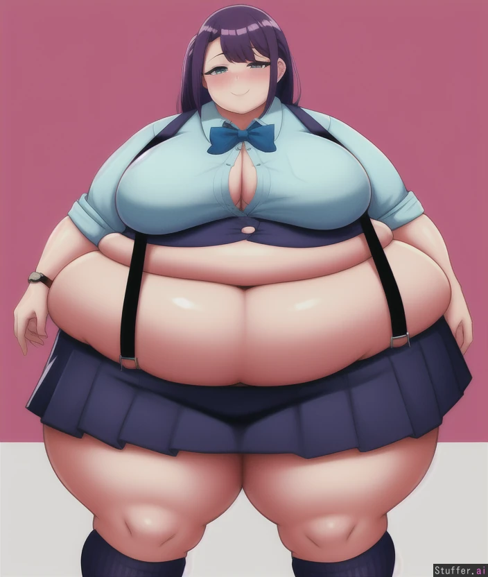 (Bright color style:0.4), (fat girl:0.4), round belly and breasts, pudgy legs, high socks, button shirt, knee length skirt with suspenders,