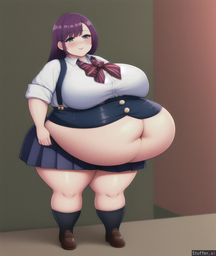 (Bright color style:0.4), (fat girl:0.4), round belly and breasts, pudgy legs, high socks, button shirt, knee length skirt with suspenders,