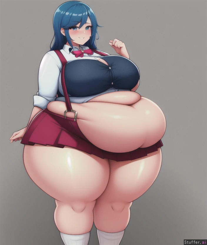 (Bright color style:0.4), (fat girl:0.4), round belly and breasts, pudgy legs, high socks, button shirt, knee length skirt with suspenders,