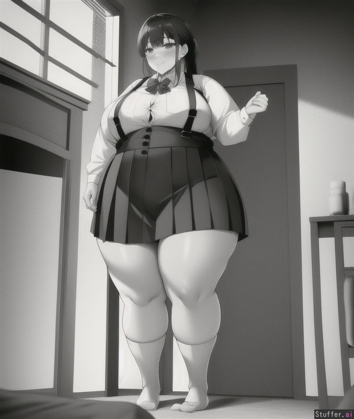 Bedroom, standing, (fat girl:0.4), pudgy legs, high socks, button shirt, (knee length skirt) with suspenders,