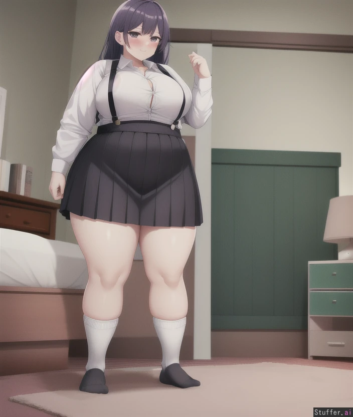 Bedroom, standing, (fat girl:0.4), pudgy legs, high socks, button shirt, (knee length skirt) with suspenders,