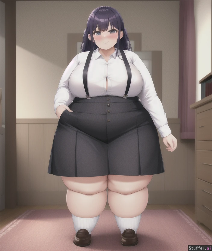 Bedroom, standing, (fat girl:0.4), pudgy legs, high socks, button shirt, (low waist knee length skirt) with suspenders,
