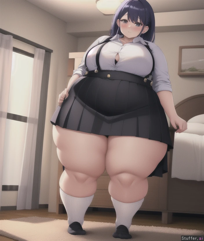 Bedroom, standing, (fat girl:0.4), pudgy legs, high socks, button shirt, (low waist knee length skirt) with suspenders,