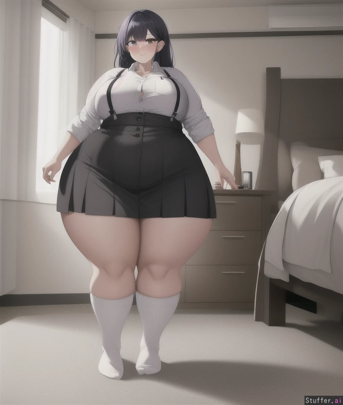 Bedroom, standing, (fat girl:0.4), pudgy legs, high socks, button shirt, (low waist long skirt) with suspenders,