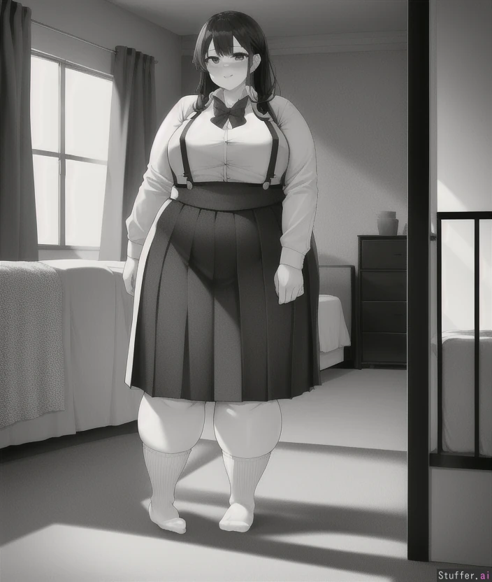 Bedroom, standing, (fat girl:0.4), pudgy legs, high socks, button shirt, (low waist long skirt) with suspenders,