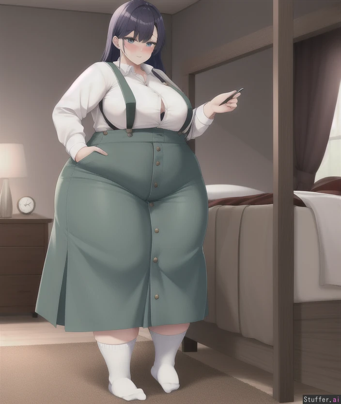 Bedroom, standing, (fat girl:0.4), (pudgy legs:0.3), high socks, button shirt, (low waist long skirt) with suspenders,