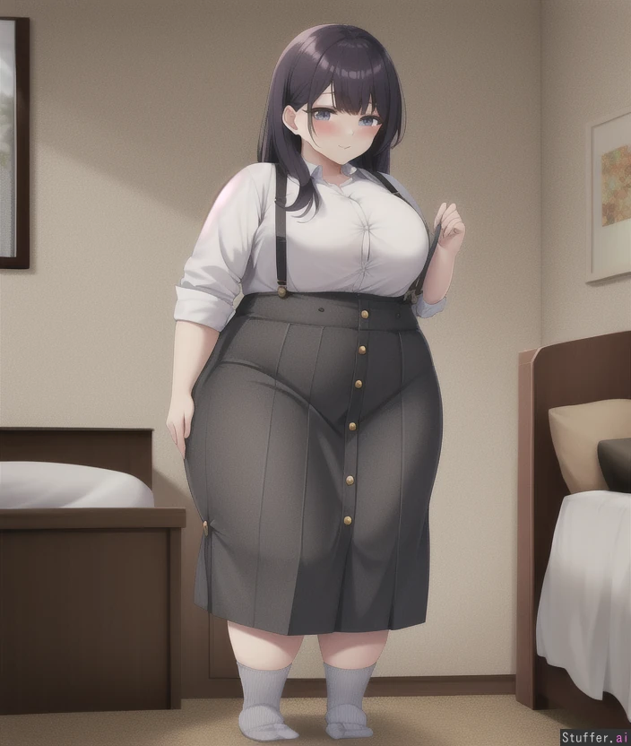 Bedroom, standing, (fat girl:0.4), (pudgy legs:0.3), high socks, button shirt, (low waist long skirt) with suspenders,