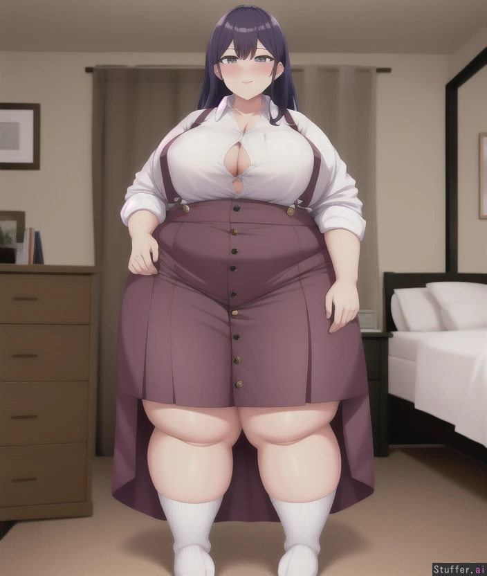Bedroom, standing, (fat girl:0.4), (pudgy legs:0.3), high socks, button shirt, (low waist long skirt) with suspenders,