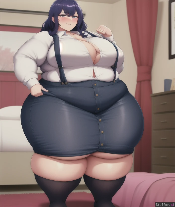 Bedroom, standing, (fat girl:0.4), flexing, (pudgy legs:0.3), high socks, strained button shirt, tight sleeves, (low waist long skirt) with suspenders,