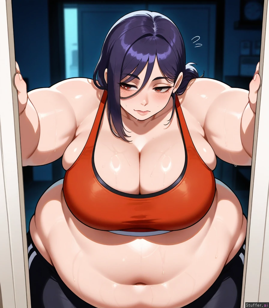 ((nyantcha)))), (krekkov), c.cu(artist), araneesama(artist), 8k, high resolution, gorgeous, masterpiece, ((flawless)), (((high rating))), ((highly detailed face)), beautiful face, ((((())))), ((((fat female)))), ((((thick milf)))), (((steamy))), (((skindentation))), ((())), ((())), ((((solo_female)))), (((()))), (((Asa from chainsaw man))), (((Sports bra, black pants))), (()), (((Cleavage))), (((fat body:1.8))), ((big breasts), ((massive thighs)), ((wide hips)), fat arms, ((voluptuous)), ((huge ass)), hourglass figure, ((sweaty)) (((Sexy, seductive))), night, in closet, embarrassed,