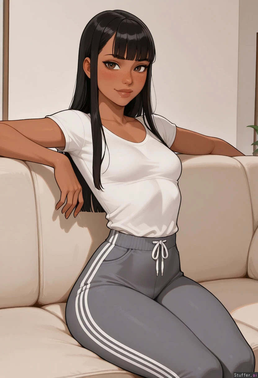 ((High quality Illustration, solo, 1 woman)), ((perfect proportions, perfect anatomy)), solo girl, (pewbutt(artist):1.5), (KAMII MOMORU(artist):1.1), (kittew(artist):1.0), (reiq(artist)), ((Brown skin, tomboy, adult woman, black straight hair, bangs, brown eyes, freckles, cheerful expression)) Laying on couch, lazy Plain t shirt, grey sweatpants, shy skinny, narrow_waist, small_breasts, skinny, (Chubby:0.40)