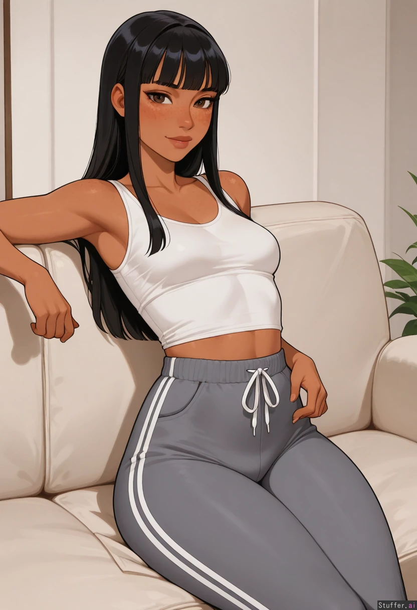 ((High quality Illustration, solo, 1 woman)), ((perfect proportions, perfect anatomy)), solo girl, (pewbutt(artist):1.5), (KAMII MOMORU(artist):1.1), (kittew(artist):1.0), (reiq(artist)), ((Brown skin, tomboy, adult woman, black straight hair, bangs, brown eyes, freckles, cheerful expression)) Laying on couch, lazy Plain t shirt, grey sweatpants, shy, narrow_waist, small_breasts, (Chubby:0.30), (muffin_top)