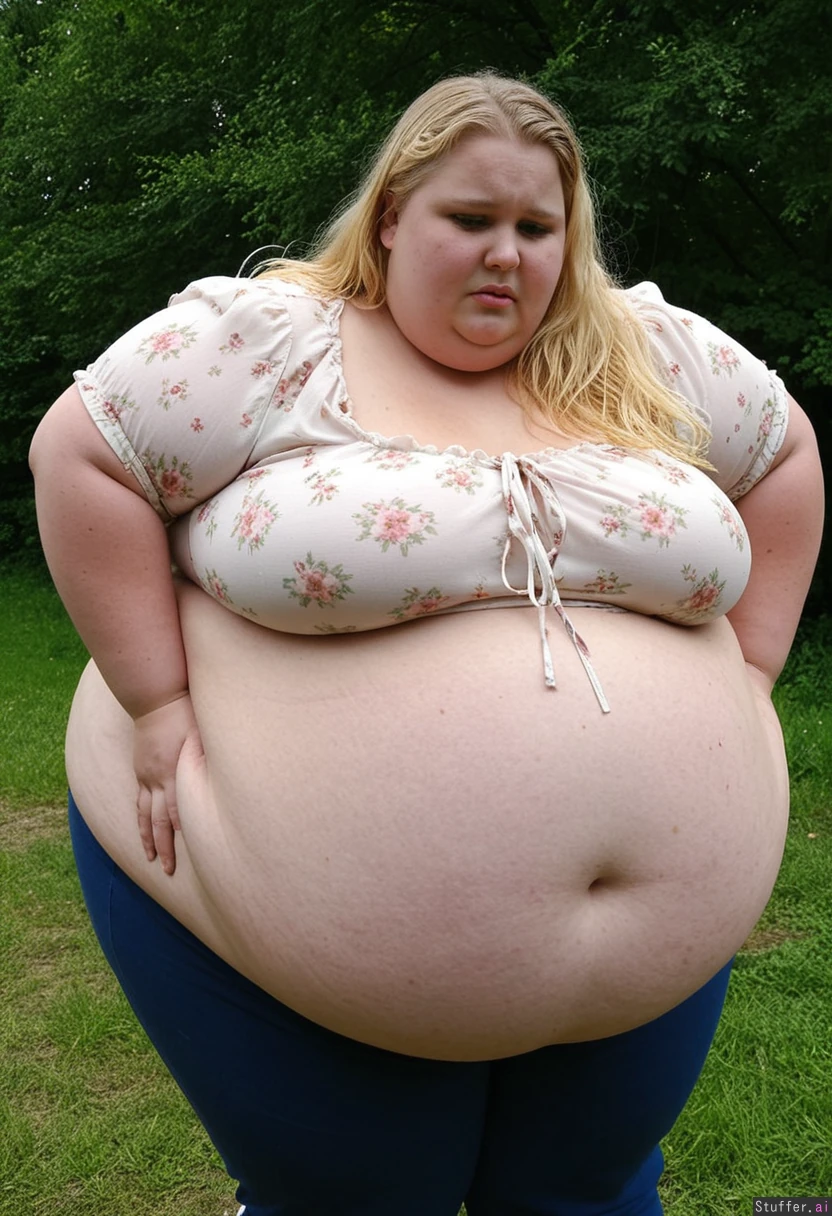 (Hyper_obese:1.4) Cute 18-yrs-old Russian USSBBW hyper-blob Blonde wet messy flowing hair, ruined makeup (Huge body) Extremely obese, humongous 200kg insatiable fatso ((Short flower blouse biting into her skin folds, high raise pants)) park stroll, stopped ((bending over, hands on her knees)) to catch her breath Gluttonous fatty who ate so much that rapidly fattened herself into giant immobile hyper-blob, too fat to move, out-of-breath, begging for help Shocked and annoyed by her ((rapid weight gain)) Very tired, exhausted, breathing heavily, intensely sweating Looking at you with pain and embarassement