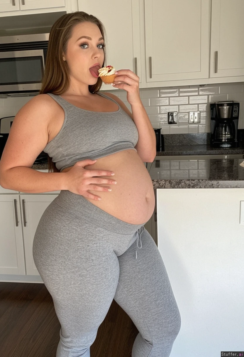 Tall skinny instagram model wearing tight gray sweatpants and tight gray tank top Long brown hair Blue eyes Standing in kitchen eating cupcake (Growing belly 0.8 Thick thighs 0.6 Rounder body 0.8 Big hanging belly 0.8 Weight gain 0.8)