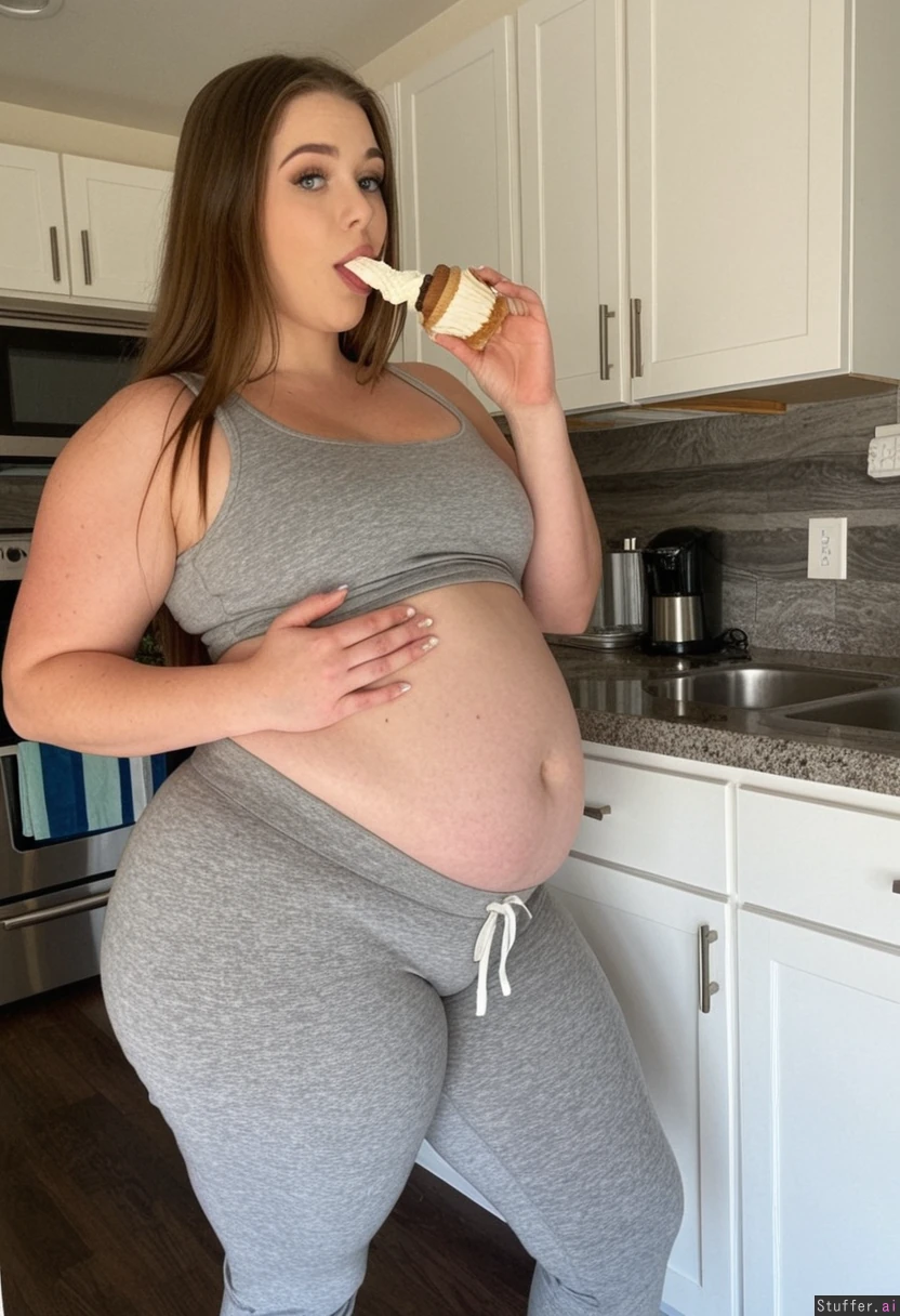 Tall skinny instagram model wearing tight gray sweatpants and tight gray tank top Long brown hair Blue eyes Standing in kitchen eating cupcake ((Growing belly 1.3 Thick thighs 0.6 Rounder body 1.3 Big hanging belly 1.3 Weight gain 1.3))