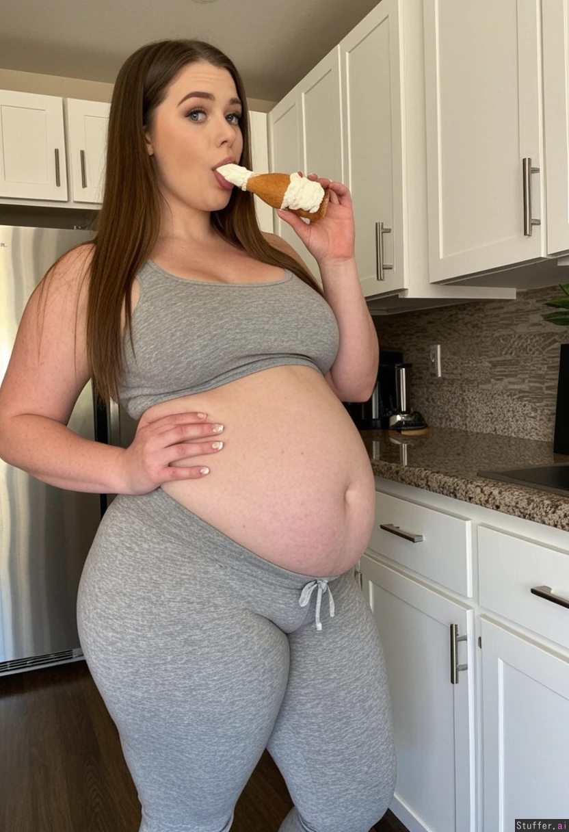 Tall skinny instagram model wearing tight gray sweatpants and tight gray tank top Long brown hair Blue eyes Standing in kitchen eating cupcake (((Growing belly 1.5 Thick thighs 1.0 Rounder body 1.5 Big hanging belly 1.5 Weight gain 1.5)))