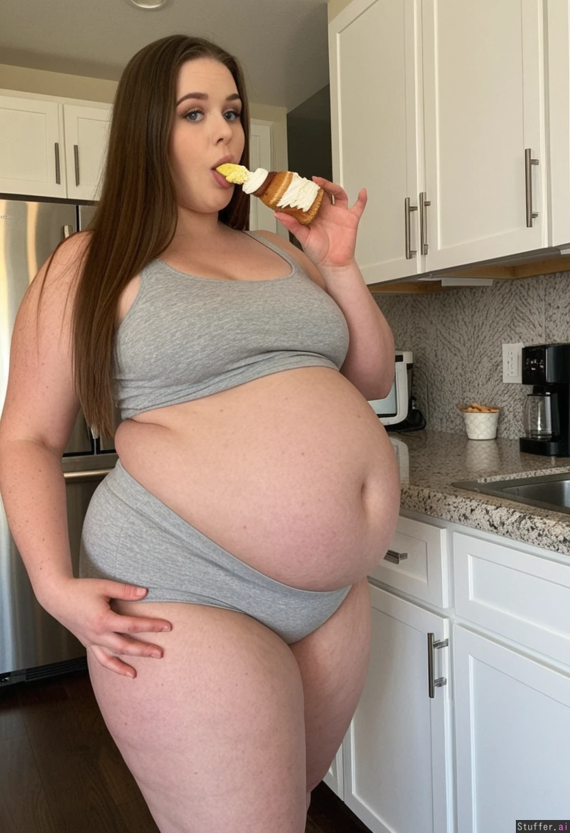 Tall skinny instagram model wearing tight gray sweatpants and tight gray tank top Long brown hair Blue eyes Standing in kitchen eating cupcake (((Big Growing belly 1.6 Thick thighs 1.0 Rounder body 1.6 Big fat hanging belly 1.6 Big Weight gain 1.6)))