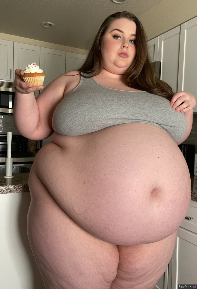 Tall skinny instagram model wearing tight gray sweatpants and tight gray tank top Long brown hair Blue eyes Standing in kitchen eating cupcake (((Big Growing massive obese belly 1.6 Very Thick giant hyper massive thighs 1.4 Rounder body 1.6 (Big extra plump fat giant massive hanging belly 1.6) Big Weight gain 1.6)))