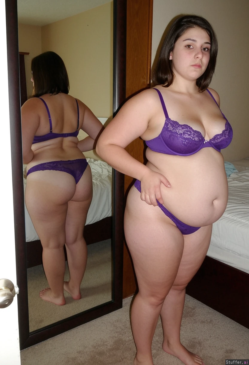 One full body Italian looking woman, 19 year old, long dark brown hair, wearing sexy purple lingerie, standing alone in her bedroom next to her bed on the floor facing camera with body, sad expression, looking in mirror grabing her fat belly Extreme super short fat leggs, extreme super short fat upper body, wide short round body, unattractive extreme fat face, big nose, fat wide hips