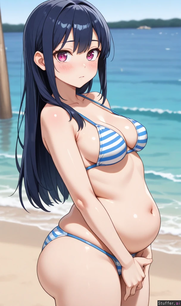 absurdres, 8k, perfect anatomy, masterpiece, beautiful eyes, big eyes, cute eyes, shining eyes, anime, side-view, milf, (solo) Appearance: Long straight dark blue hair with light blue stripes, beautiful wide expressive big sparkling light pink eyes, starry pupils, light skin, oblivious, blushing heavily, submissive eyes, feedee, horny, anime-woman, Outfit: bikini Location: Standing up, at beach, front-side-view, looking at viewer Modifiers: (Slim figure:1.5), (medium breasts:1.3), (plump figure:1.25), (fat butt:1.1), (obese:0.6), (chubby belly:1.1),