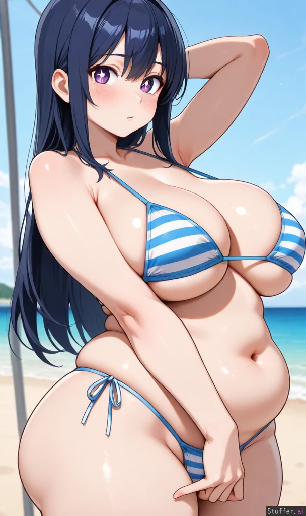 absurdres, 8k, perfect anatomy, masterpiece, beautiful eyes, big eyes, cute eyes, shining eyes, anime, side-view, milf, (solo) Appearance: Long straight dark blue hair with light blue stripes, beautiful wide expressive big sparkling light pink eyes, starry pupils, light skin, oblivious, blushing heavily, submissive eyes, feedee, horny, anime-woman, Outfit: bikini Location: Standing up, at beach, front-side-view, looking at viewer Modifiers: (Slim figure:1.35), (large breasts:1.25), (plump figure:1.35), (fat butt:1.1), (obese:0.6), (chubby belly:1.1),