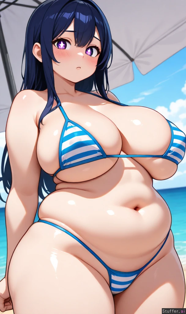 absurdres, 8k, perfect anatomy, masterpiece, beautiful eyes, big eyes, cute eyes, shining eyes, anime, side-view, milf, (solo) Appearance: Long straight dark blue hair with light blue stripes, beautiful wide expressive big sparkling light pink eyes, starry pupils, light skin, oblivious, blushing heavily, submissive eyes, feedee, horny, anime-woman, erect nipples Outfit: bikini Location: Standing up, at beach, front-side-view, looking at viewer Modifiers: (Slim figure:1.0), (large breasts:1.45), (plump figure:1.6), (fat butt:1.1), (obese:1.0), (chubby belly:1.1),