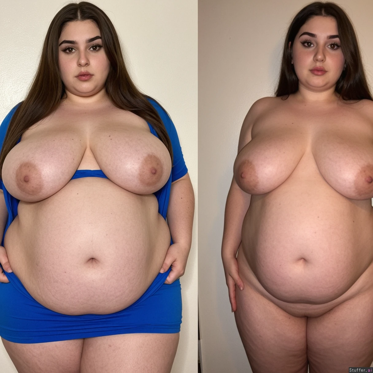 Brunette Armenian supermodel, sexy instagram model face, beautiful face, 21 years old, super huge pregnant stuffed overfilled belly, full body view, very plump lips, erected nipples, dark eyeliner, nude boobs, huge areola and nipples Bigger hips weight gain, fuller breast weight gain, tighter dress, bigger hips weight gain, wider body weight gain, huge weight gain, ((((fatter hips weight gain))))1.9