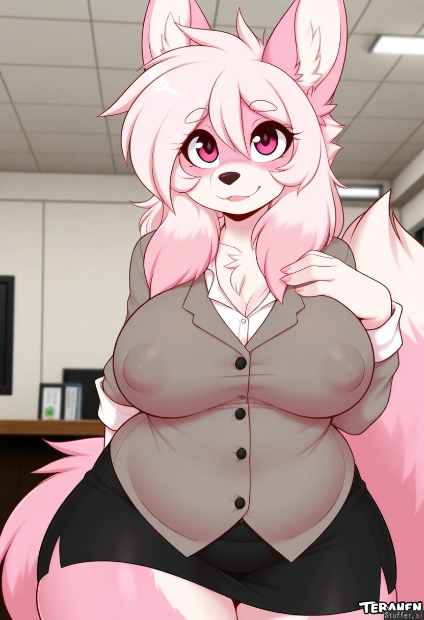 Teranen(artist), furry_female, furry, anthro fox, solo, office_attire, chubby_belly, office background, pink_fur, body_fur, pink_eyes, short, puffy nipples, ((covered nipples, erect nipples)),
