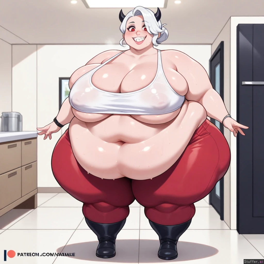 Cyancapsule(artist), Krekkov(artist), KAMII MOMORU(artist), pewbutt(artist), nyantcha(artist), araneesama(artist), Lewdlemage(artist), mrpeculiart(artist), masterpiece, hyper resolution, realistic, realistic hands, ((1 girl)), best quality, high rating, dynamic lighting, (detailed eyes), (perfect eyes), ((big eyes, wide eyes)), (beautiful nose), high detail, (perfect face), beautiful face, (Detailed), ((1 girl, solo)), ((highly detailed eyes)), high definition, beautiful lighting, well drawn, pinup style, ((wide fat face, thick double chin, fat jawline):1.3), ((chubby cheeks, round head, fat jowls):1.1), (Zdrada_(Helltaker), white hair, hair covering one eye, red eyes), ((sharp teeth, pointy teeth, perfect teeth, huge mouth)), long eyelashes, dark eyeshadow, extreme blushing, belly blush, chest blush, (eyeliner), (lipstick), ((black eyeshadow, heavy eyeshadow)), ((long eyelashes)), ((half lidded eyes)), ((blushing heavily)), (((fat body))), curvy, ((massive wide hips)), ((massive breasts)), (round breasts), (fat thighs), ((chubby belly)), ((round belly)), ((big fat arms)), bulging breasts, cleavage overflow, (navel_divot), thigh overflow, huge shelf butt, bulging thighs, (breasts are the same size, round breasts, bulging breasts, overflowing breasts), (huge ass, plump ass, underbutt, rotund butt), (gigantic thick thighs, thighs wider than hips), (extra wide hips, Huge hips, extremely massive hips, hips wider than shoulders, doublewide hips, massive wide hips), (thick fat legs, love handles), thigh overflow, (plain white tank top, red leggings, black boots), (low-rise)), cleavage, underboob, looking at viewer, happy expression, aroused, flirty eyebrows, (big eyes, wide grin, huge grin), (living room, standing), (extremely sweaty), (covered in sweat), (disproportionately big legs and ass, gigantic oversized thick thighs, gigantic hyper wide hips, gigantic fat ass), ((Expansion fetish, weight gain, ass expansion, hip expansion, breast expansion, sudden weight gain, getting fatter)), ((massive lips, gigantic thick lips):1.2), ((plump lips, full lips, bimbo lips)), (crazy smile), puffy nipples, ((covered nipples, erect nipples)), (huge areola, puffy areola), chubby, steaming_body, sweaty, super-skindentation, ((thigh-overflow)), (((ShortStack))), obese, (butt_crack), (full body view),