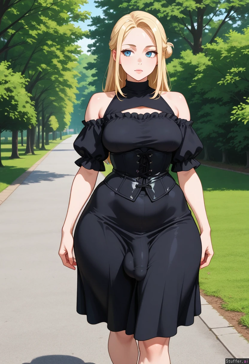 Solo, transgender female, 21 year old, adult, Blonde hair in a low bun, blue eyes, Dark skirt with a black corset and black top, penis bulge under clothes Overweight, medium breasts wide hips, big thighs, wide shoulders, tiny penis, saggy balls, On the walk, in the park,